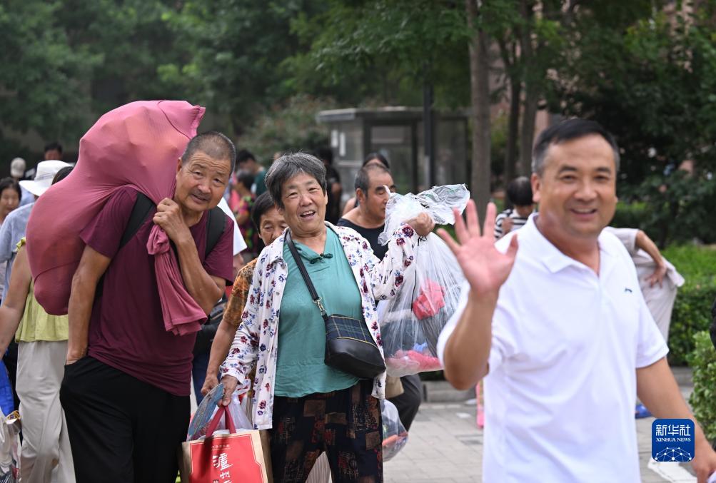 8月20日,在天津市西青区赤龙南街道一临时安置点,村民收拾行李准备回家。