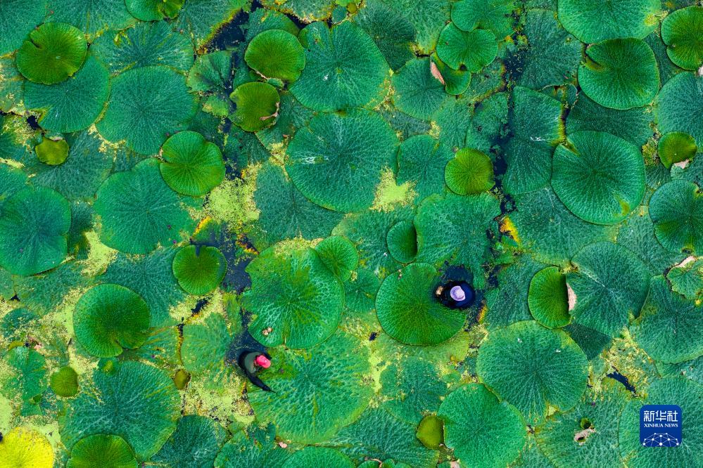 8月21日,江苏省泰州市姜堰区顾高镇申俞村农民在采收芡实(无人机照片)。