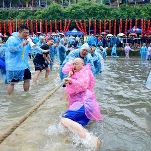 当日,在湖北省恩施土家族苗族自治州宣恩县仙山贡水旅游区的贡水河中,近千名居民和游客组成60余支拔河队在河中开展趣味拔河比赛,感受快乐与清凉。