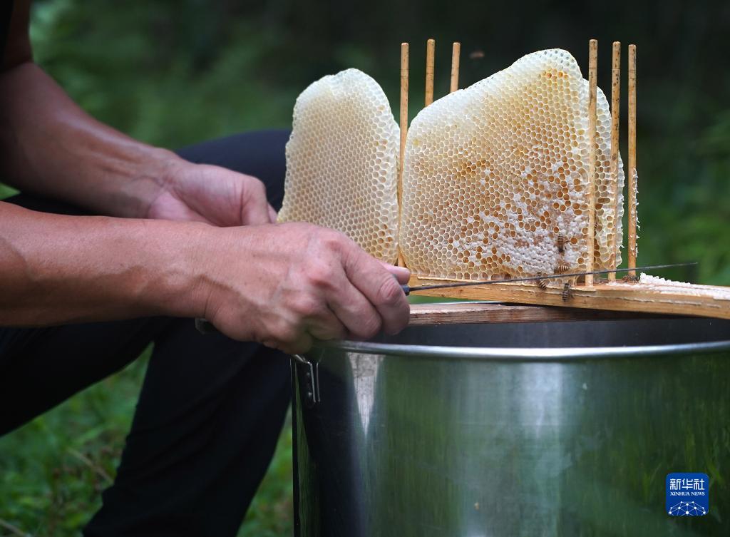 村民刘煌平用刀割蜜(8月24日摄)。