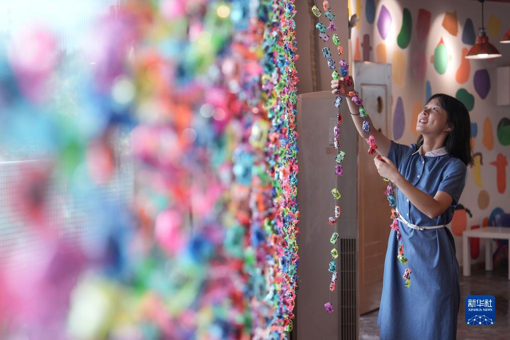 8月27日,在重庆市北碚区缙云幼儿园美术室,教师在整理玩具挂件。