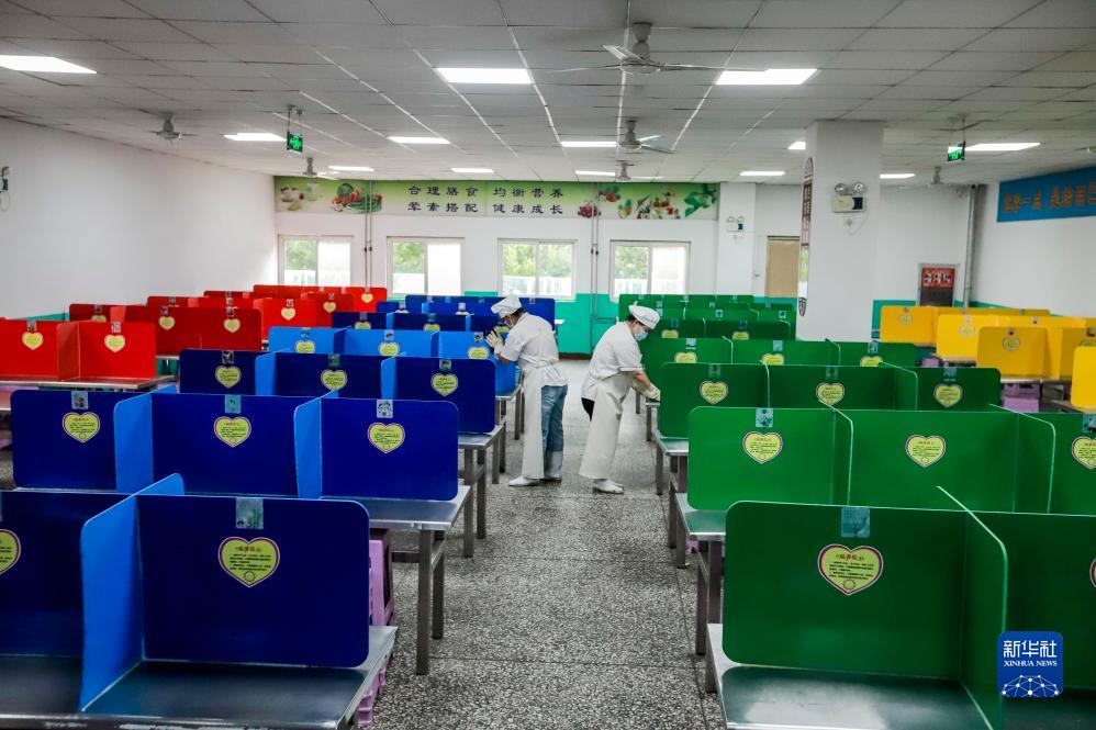 8月27日,河北省遵化市第三中学的工作人员在擦拭学生餐桌。