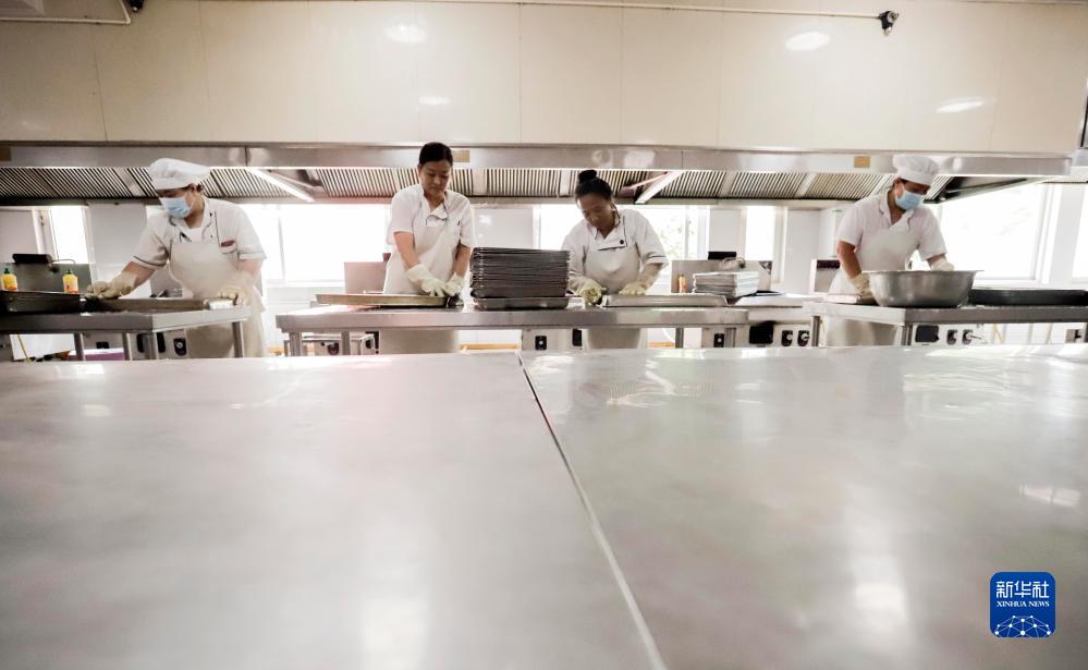 8月27日,河北省遵化市第三中学的厨师在打扫厨房卫生。