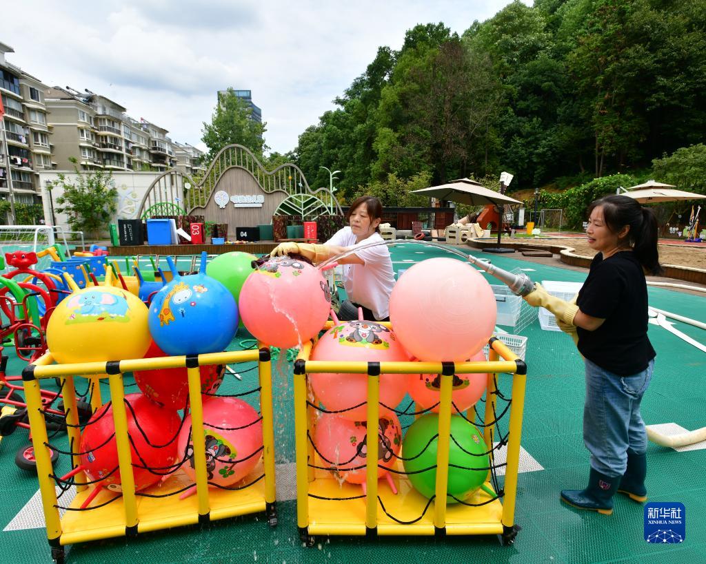 8月27日,工作人员在浙江省建德市明珠幼儿园操场上清洗儿童玩具。