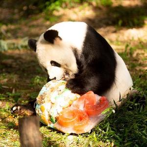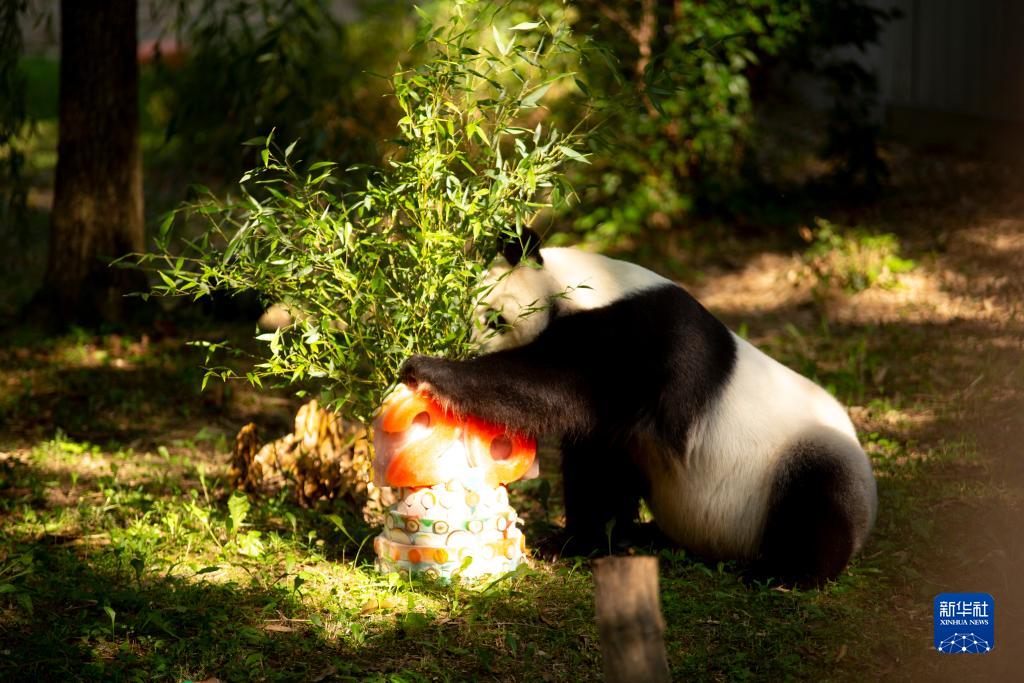 8月27日,大熊猫“添添”在美国首都华盛顿史密森学会国家动物园享用生日蛋糕。