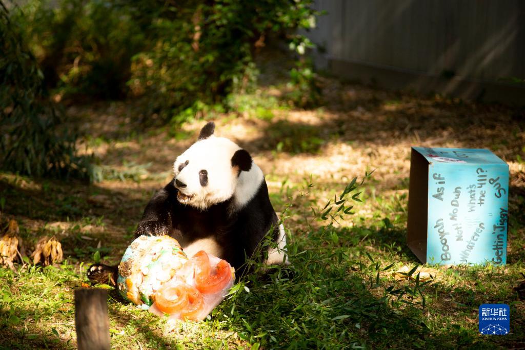 8月27日,大熊猫“添添”在美国首都华盛顿史密森学会国家动物园享用生日蛋糕。