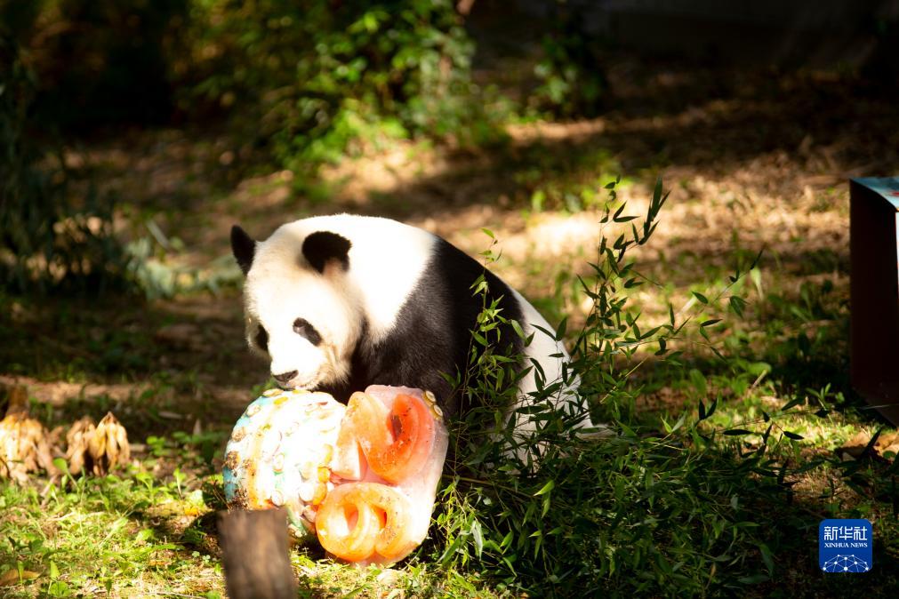 8月27日,大熊猫“添添”在美国首都华盛顿史密森学会国家动物园享用生日蛋糕。