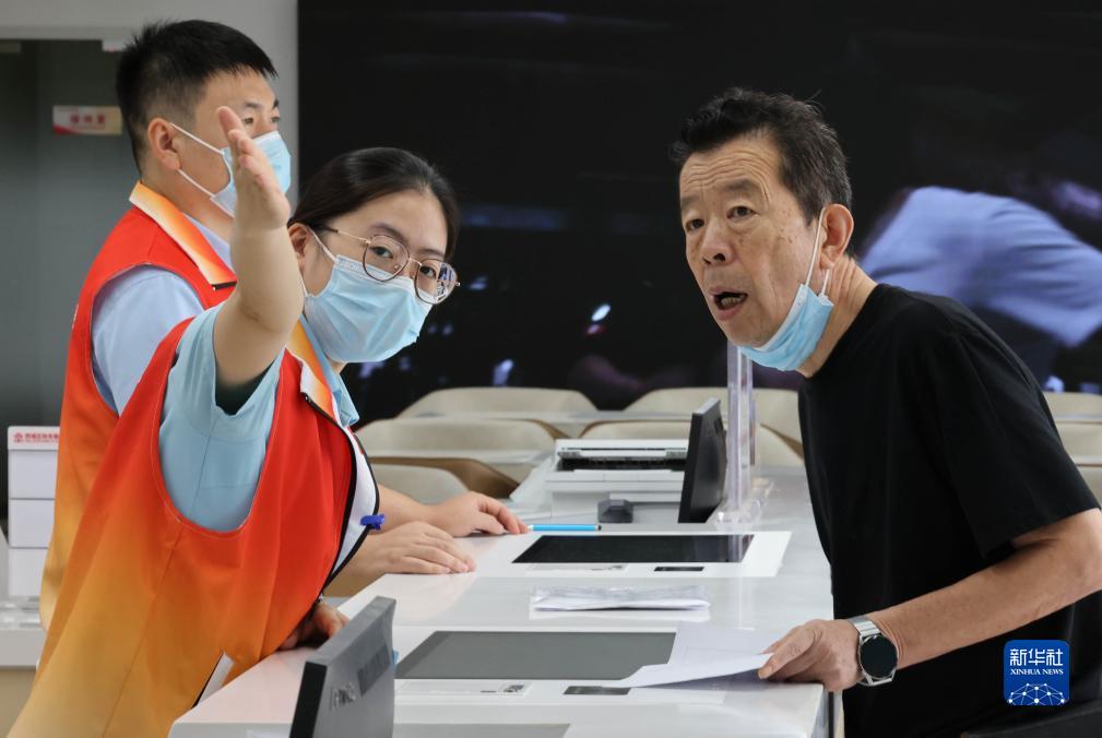 8月25日,在北京市公安局西城分局出入境接待大厅,工作人员在引导一位男士去相应的办理区域。