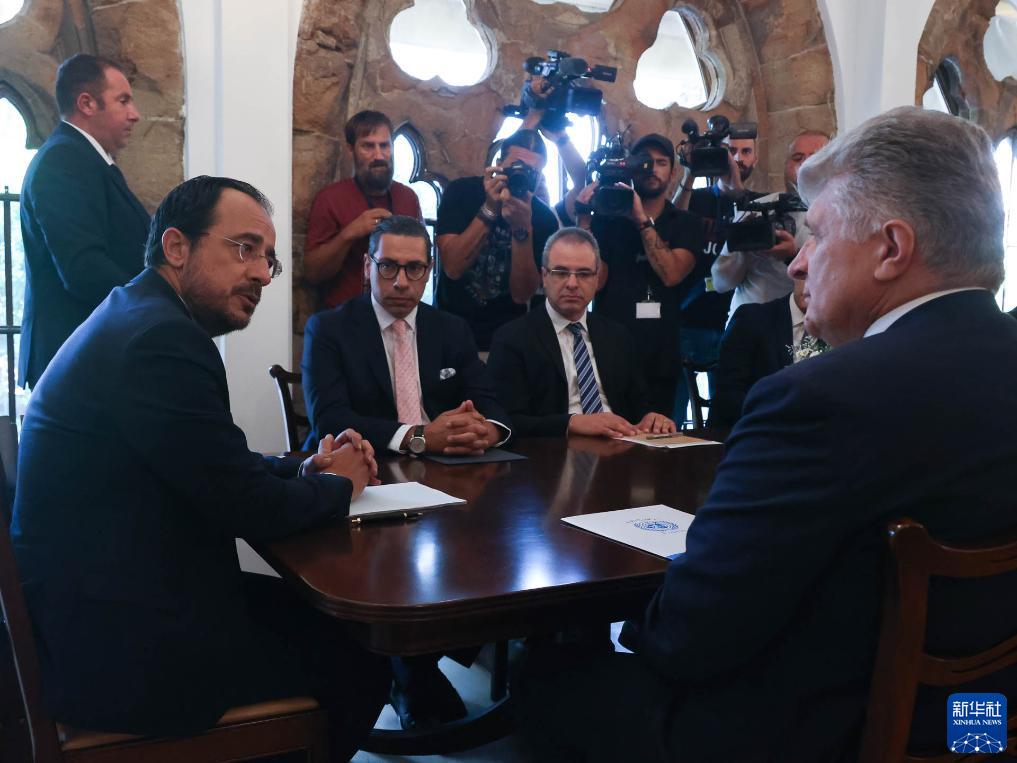 8月28日,在塞浦路斯尼科西亚,联合国负责欧洲、中亚和美洲事务的助理秘书长米洛斯拉夫·延恰(前右)与塞浦路斯希腊族领导人、总统赫里斯托祖利季斯(前左)举行会谈。