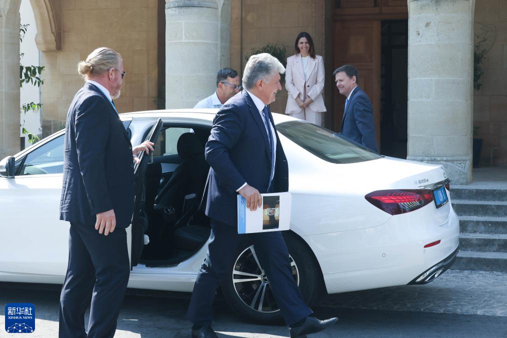 8月28日,联合国负责欧洲、中亚和美洲事务的助理秘书长米洛斯拉夫·延恰(前右)抵达塞浦路斯尼科西亚总统府。