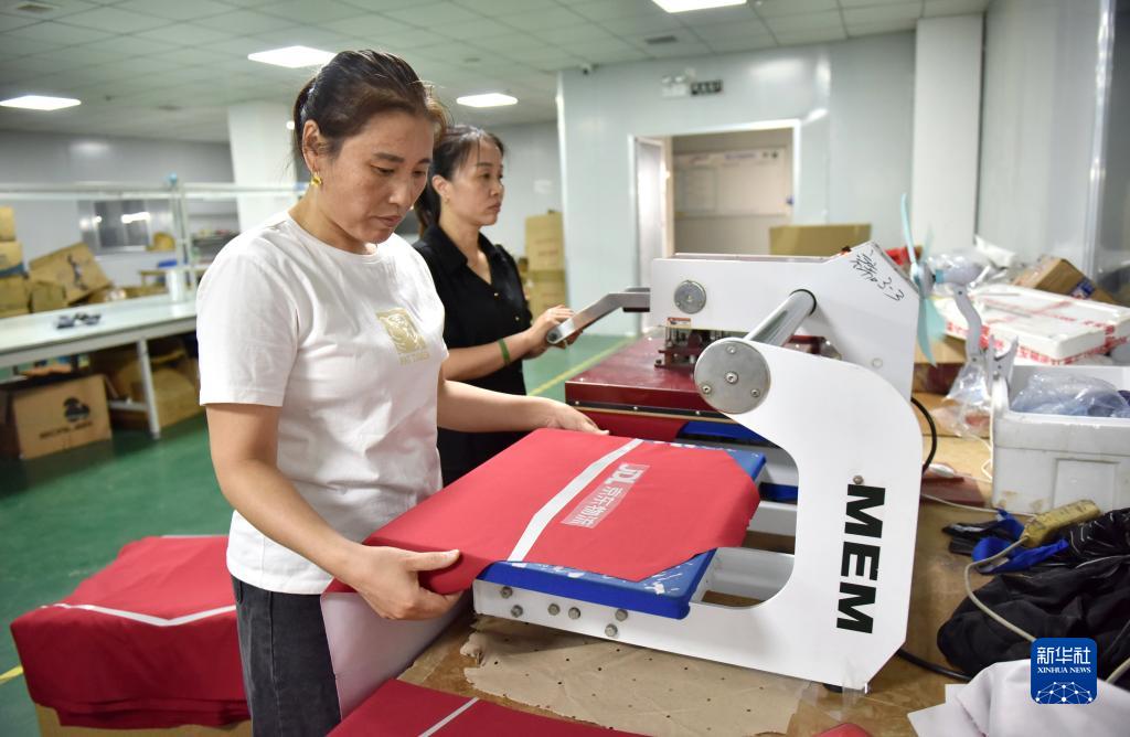 8月29日,工人在河北省威县姜七里村一家服饰厂对加工服饰进行压花作业。