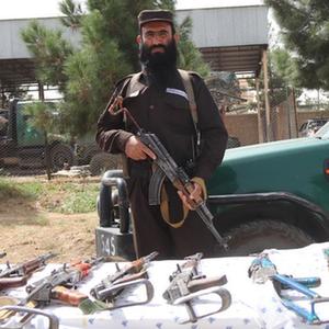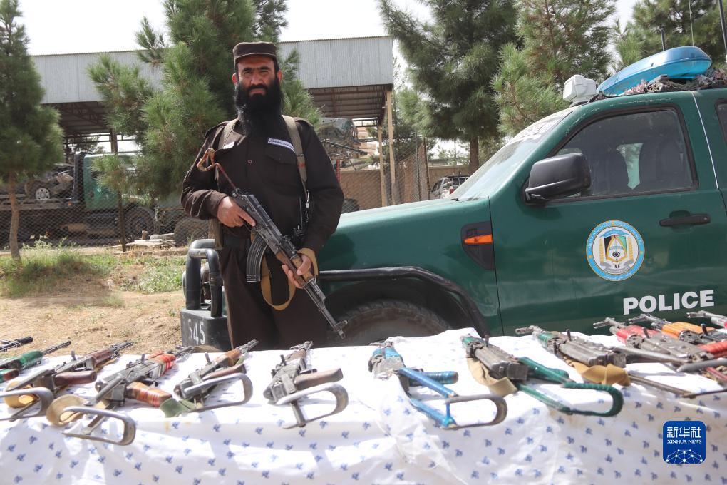 这是8月29日在阿富汗巴尔赫省拍摄的被阿富汗安全部队收缴的武器。