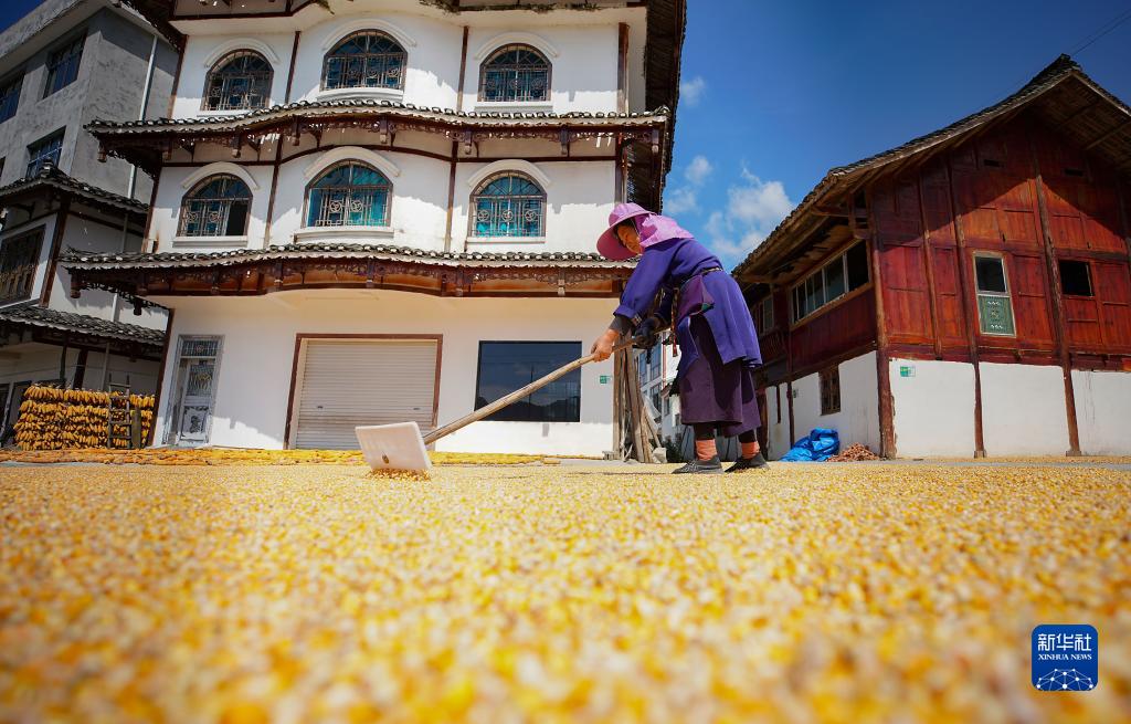 8月29日,贵州省黔东南苗族侗族自治州丹寨县龙泉镇马寨村村民在晾晒玉米。