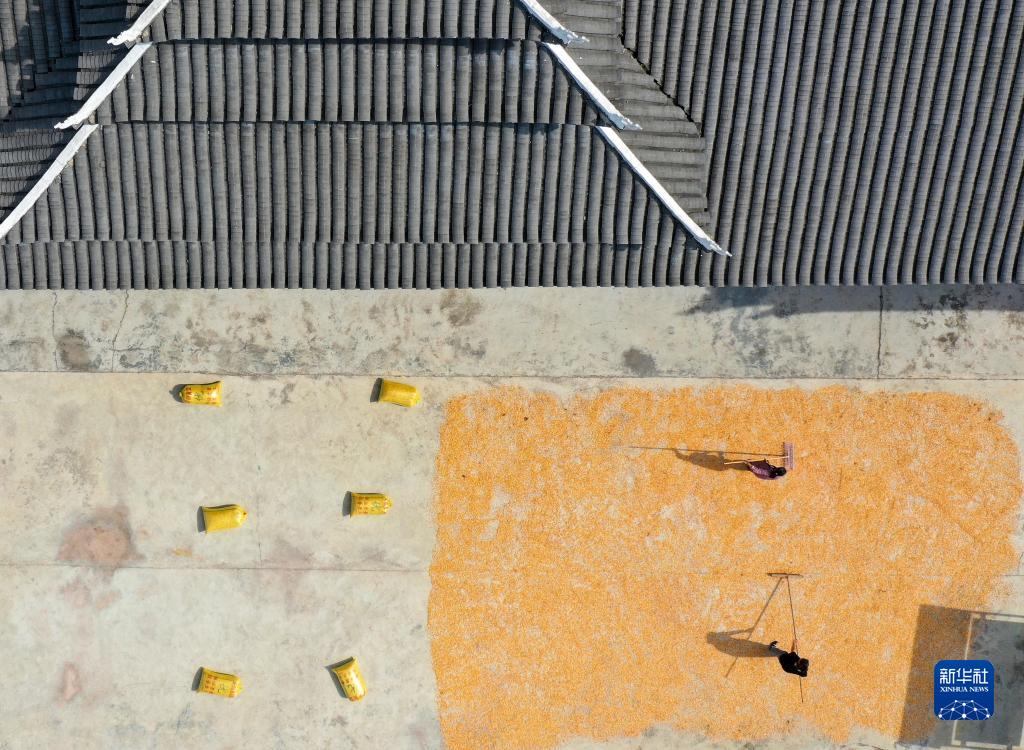 8月29日,贵州省铜仁市玉屏侗族自治县亚鱼乡郭家湾村农民在翻晒收获的玉米(无人机照片)。