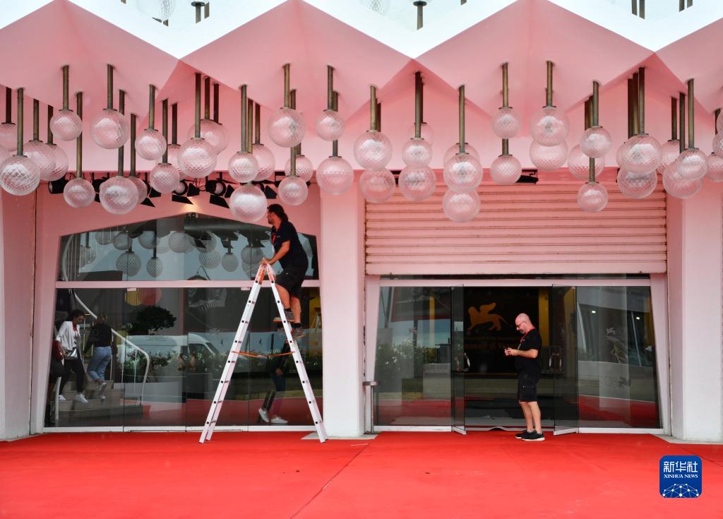 8月29日,在意大利威尼斯利多岛,工作人员在电影节开幕式红毯区域做准备。