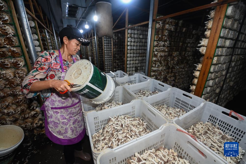 8月29日,村民在位于浙江省丽水市庆元县竹口镇的秀珍菇生产基地内采收秀珍菇。该基地依托智慧农业大棚调节棚内温度,根据客户的需求量设置不同室温以控制秀珍菇的生长速度和产量。