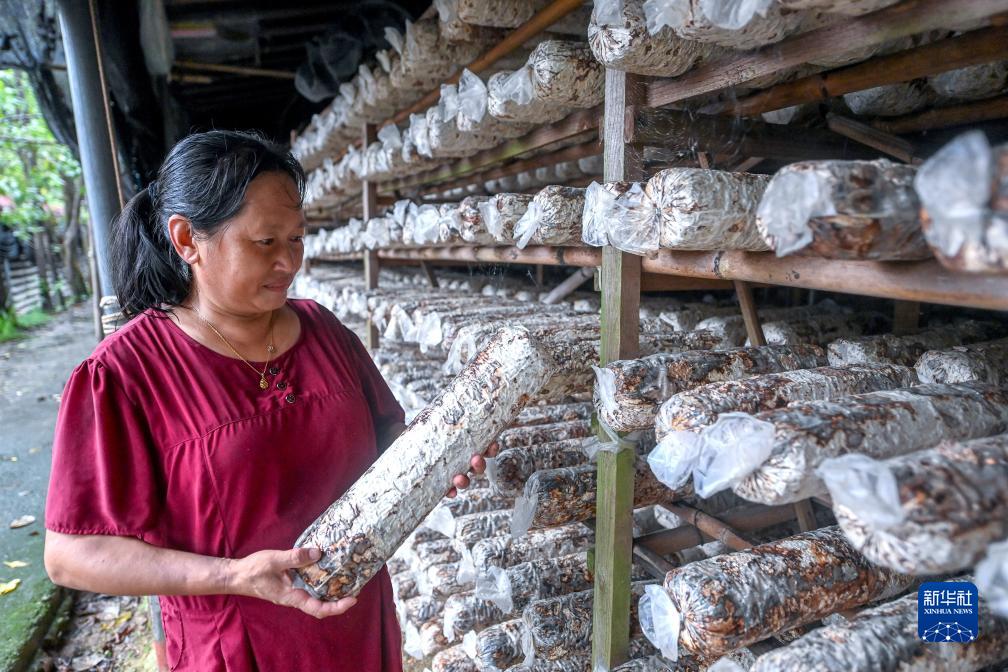 8月29日,种植户陈金英在浙江省丽水市庆元县濛洲街道冬瓜源食用菌基地查看菌棒上香菇的长势情况。陈金英家种植了三万根菌棒,年收入十多万元。
