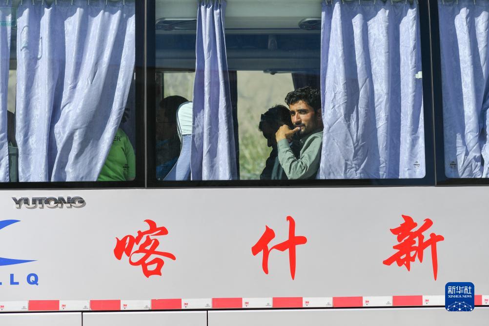 在新疆红其拉甫口岸,巴基斯坦商人坐在即将出发的国际客运班车上(8月29日摄)。