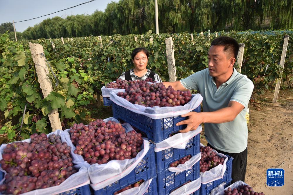 8月30日,邢台市威县戚霍寨村一家庭农场果农整理装筐的葡萄。