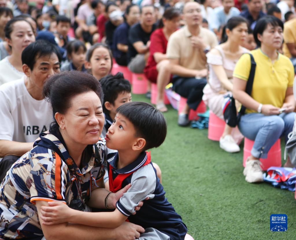 8月30日,海口市玉沙实验学校的一年级新生和家长在“开笔礼”仪式活动现场。