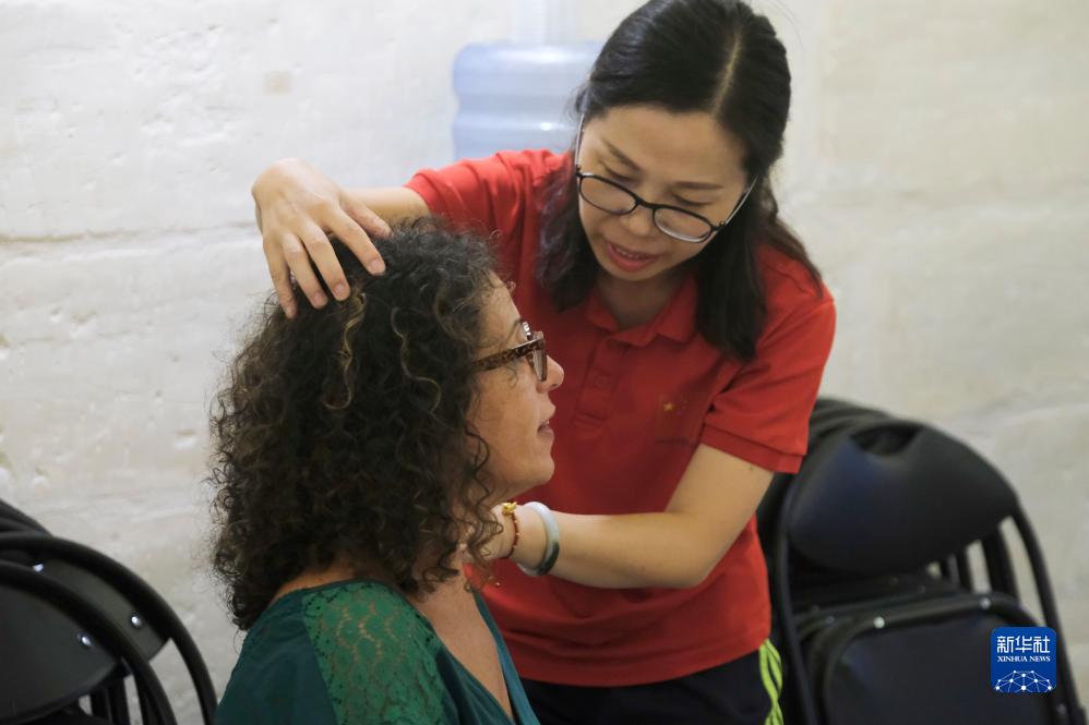 8月28日,在马耳他榟橔市,中国援马耳他医疗队队长董晓燕为一名妇女提供义诊服务。