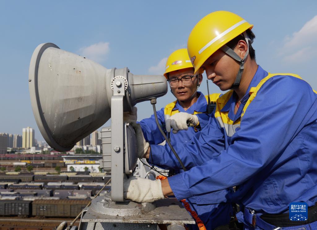 8月29日,中国铁路郑州局集团有限公司郑州供电段工作人员在郑州北站编组场的灯桥上检修投光灯。