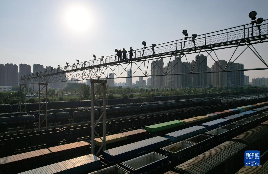 8月29日,中国铁路郑州局集团有限公司郑州供电段工作人员在郑州北站编组场的灯桥上检修投光灯(无人机照片)。