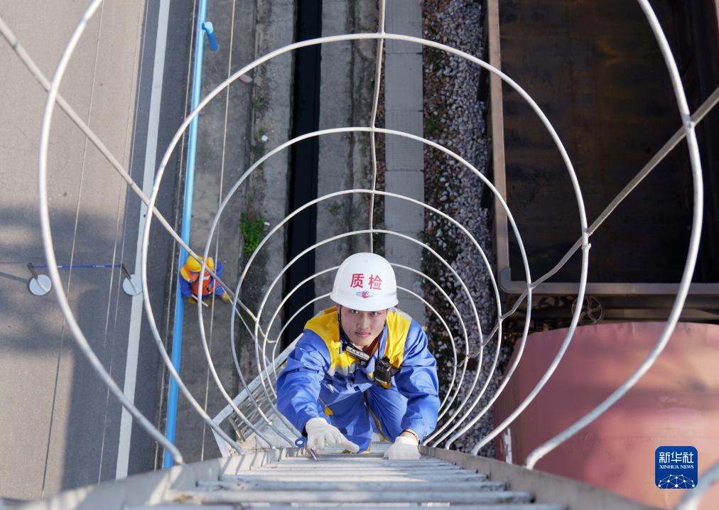 8月29日,中国铁路郑州局集团有限公司郑州供电段工作人员在郑州北站编组场内攀爬灯桥。