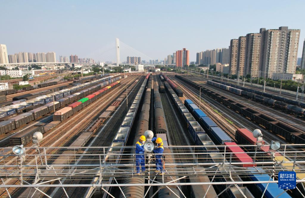 8月29日,中国铁路郑州局集团有限公司郑州供电段工作人员在郑州北站编组场的灯桥上检修投光灯(无人机照片)。