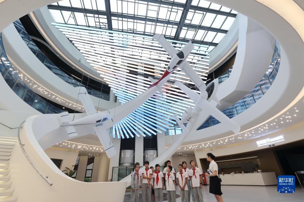 8月30日,在德清县通航智造小镇通用航空科普体验馆,雷甸镇中心小学学生在参观航空科普展品。