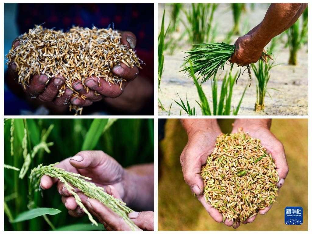 拼版照片:左上图为陈良东在展示发芽的稻种,准备播种(4月6日摄);右上图为陈良东在水稻制种基地里插秧(5月29日摄);左下图为陈良东在查看水稻授粉情况(8月1日摄);右下图为陈良东展示收获的水稻种子(8月26日摄)。