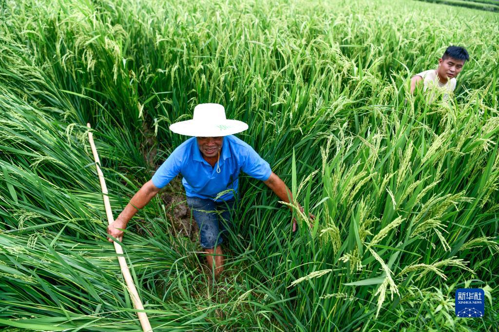陈良东在杂交水稻制种基地利用竹竿进行人工“赶花”授粉(8月1日摄)。