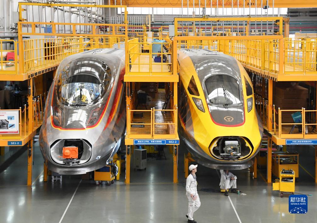 8月29日,中车青岛四方总装车间工作人员在复兴号智能动车组生产线上进行装配作业。