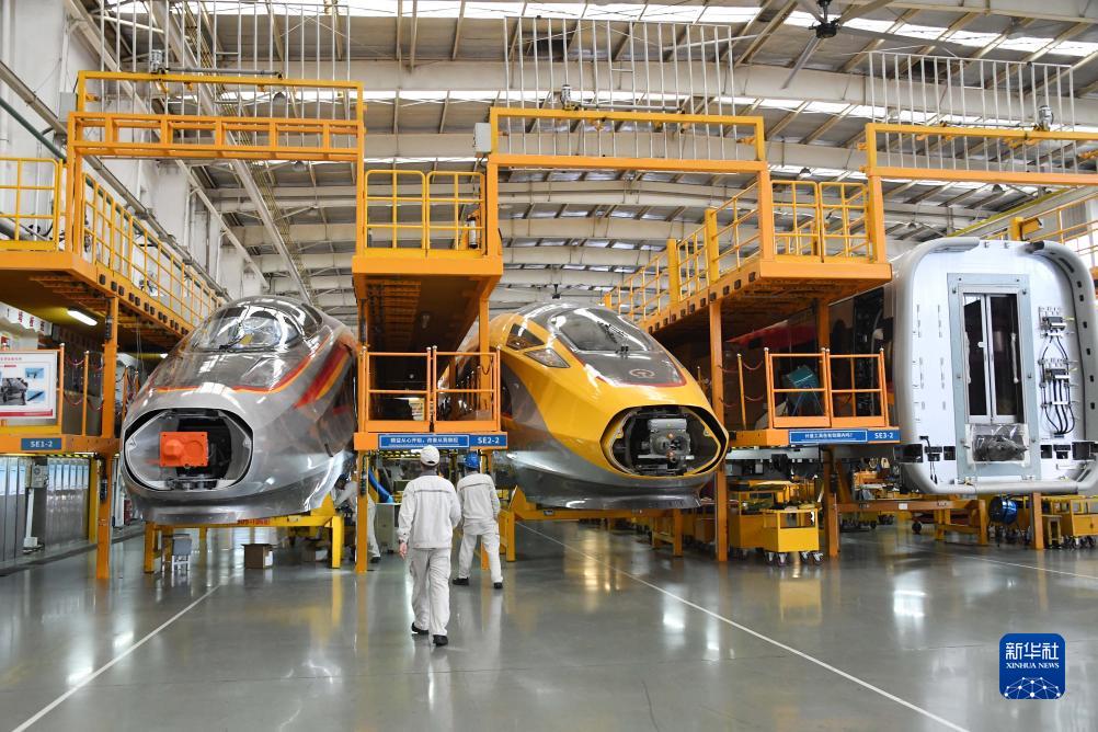 8月29日,中车青岛四方总装车间工作人员在复兴号智能动车组生产线上进行装配作业。