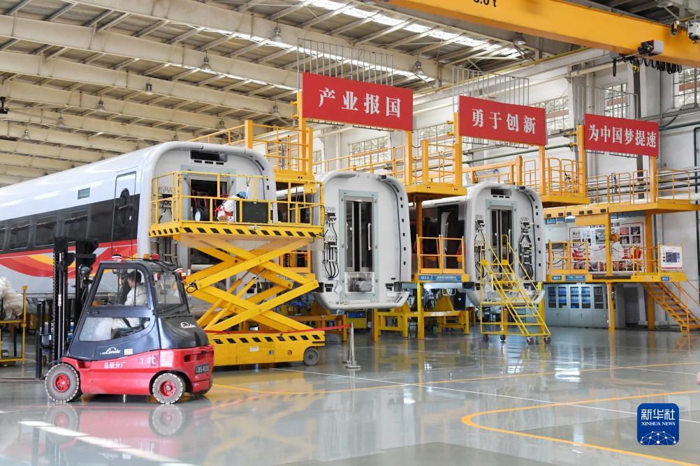 8月29日,中车青岛四方总装车间工作人员在复兴号智能动车组生产线上进行装配作业。