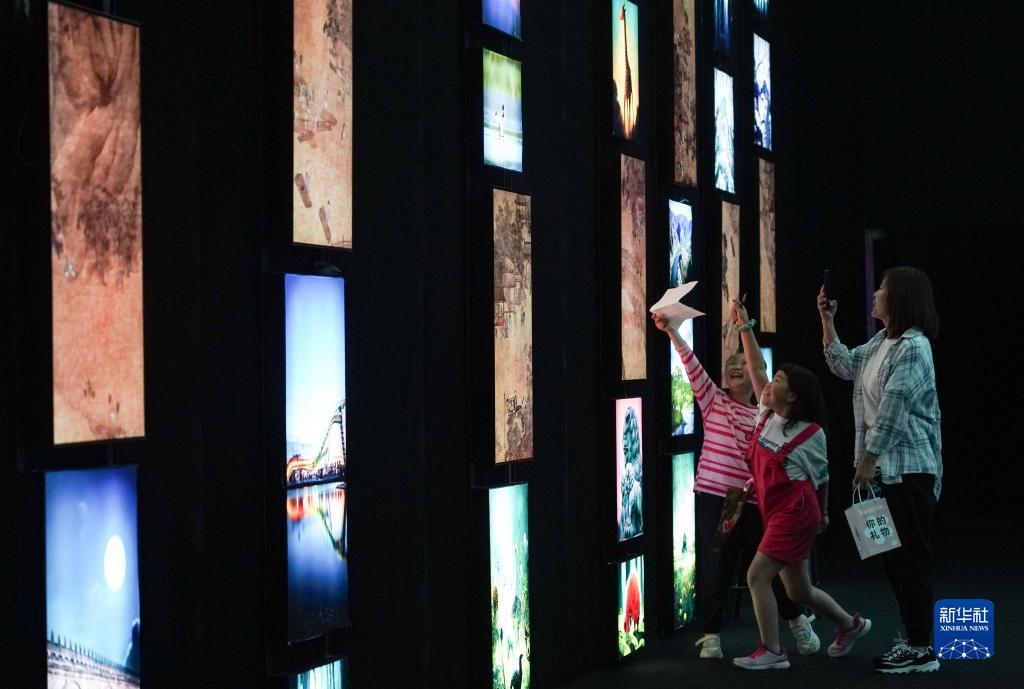 5月14日,在位于北京市石景山区首钢园的瞭仓数字藏品博物馆,观众在一间以永定河生态为主题、展示动态画作、实景照片和人工智能生成画作的展厅里参观。