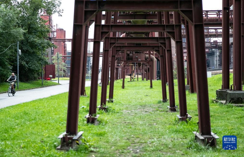 8月16日,一名男子在德国埃森的关税同盟煤矿工业区骑车。