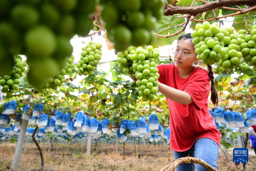 8月30日,潘雅洁在肥西县紫蓬镇的葡萄园里采摘葡萄。