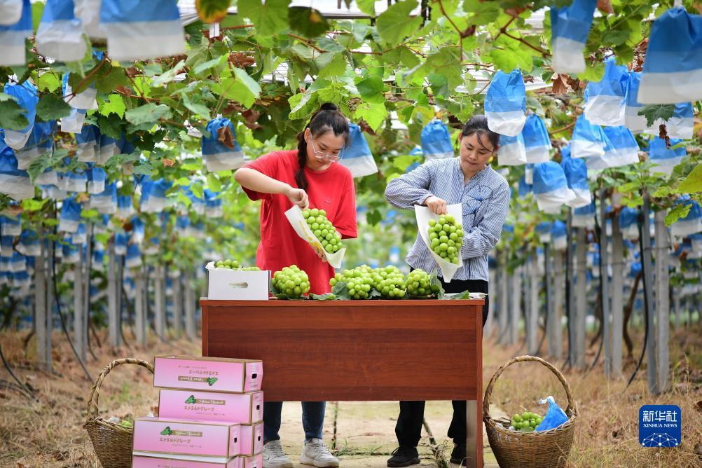 8月30日,潘雅洁(左)在肥西县紫蓬镇的葡萄园里包装刚采摘的葡萄。