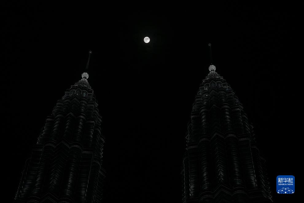 8月30日,“超级月亮”在马来西亚吉隆坡双子塔上空升起。