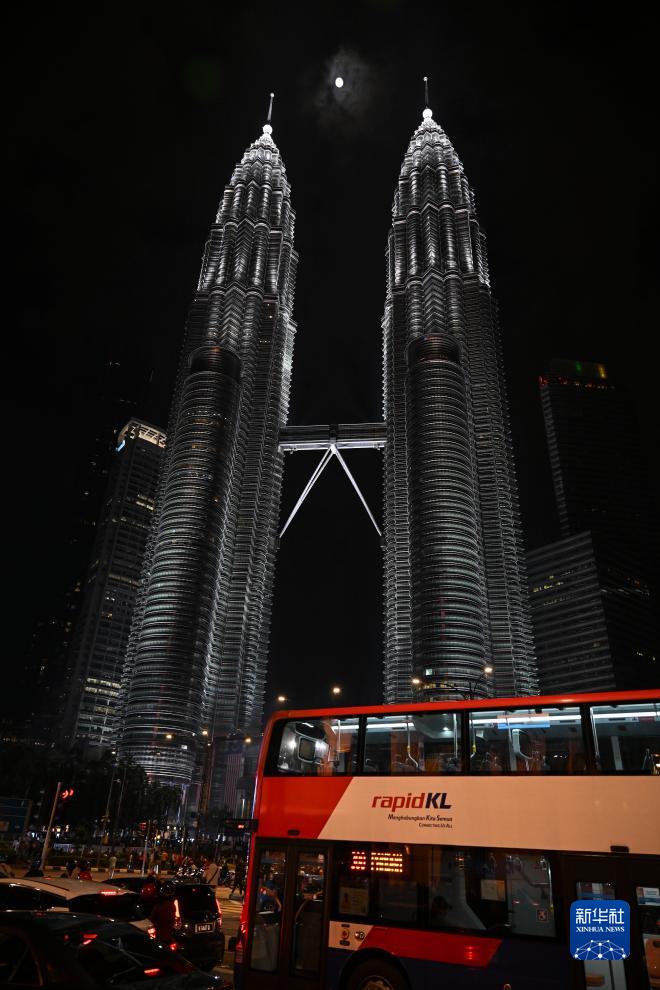 8月30日,“超级月亮”在马来西亚吉隆坡双子塔上空升起。