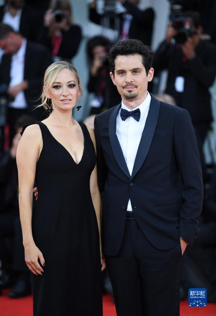 8月30日,在意大利威尼斯,主竞赛单元评审团主席、导演达米安·沙泽勒(右)和演员奥利维娅·汉密尔顿亮相开幕式红毯。