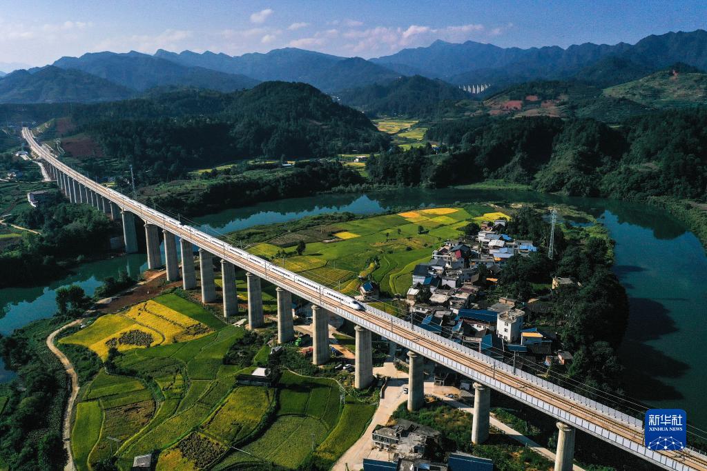 8月31日,一列动车组列车经过位于贵州省都匀市境内的贵南高铁营盘清水河双线特大桥(无人机照片)。