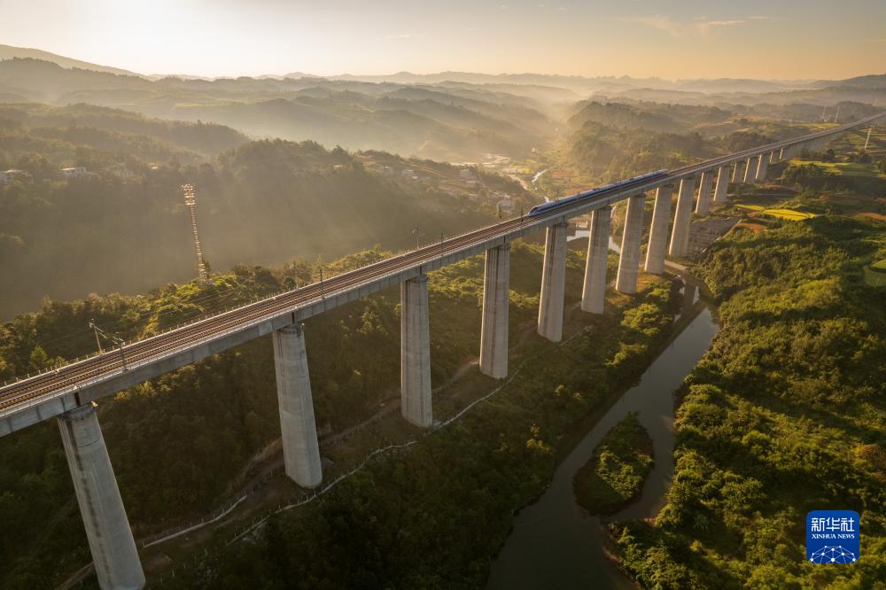 8月31日,一列动车组在晨曦中经过位于贵州省独山县郊外的贵南高铁银坡河特大桥(无人机照片)。