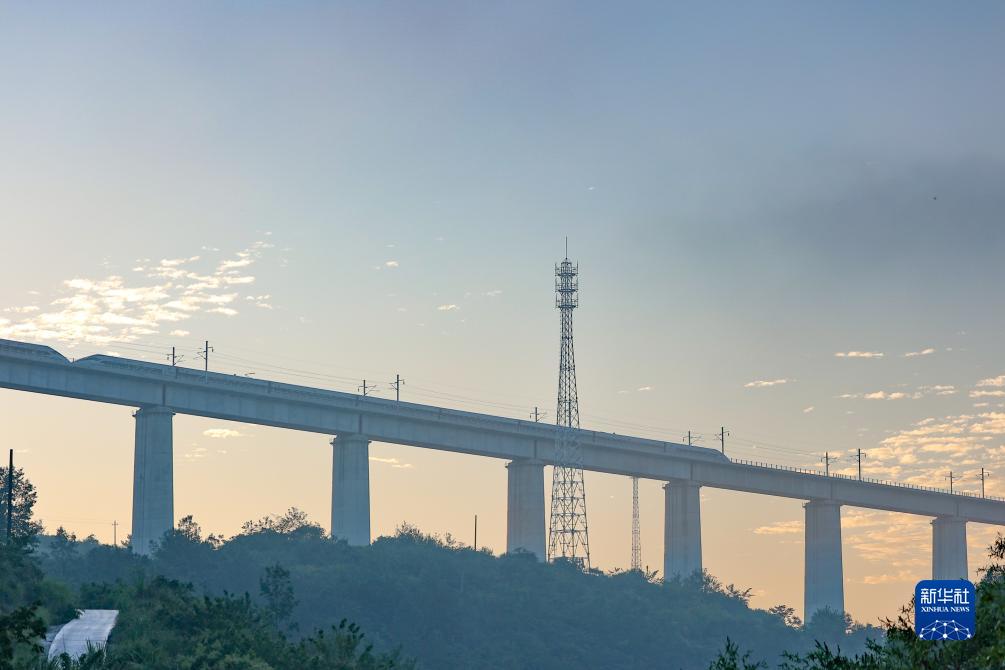 8月31日,一列动车组在晨曦中经过位于贵州省独山县郊外的贵南高铁银坡河特大桥。