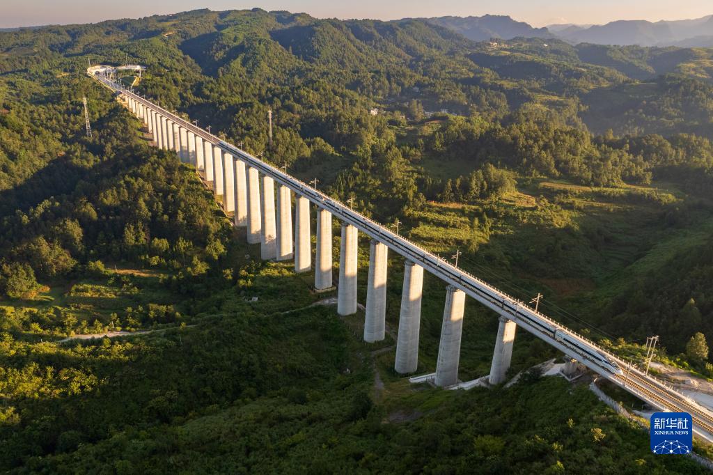 8月31日,一列动车组在晨曦中经过位于贵州省独山县郊外的贵南高铁银坡河特大桥(无人机照片)。