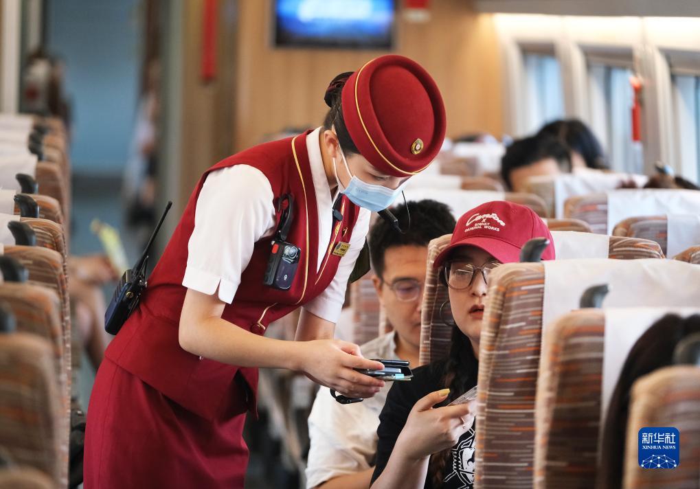 8月31日,京津城际列车乘务人员在查验旅客车票。
