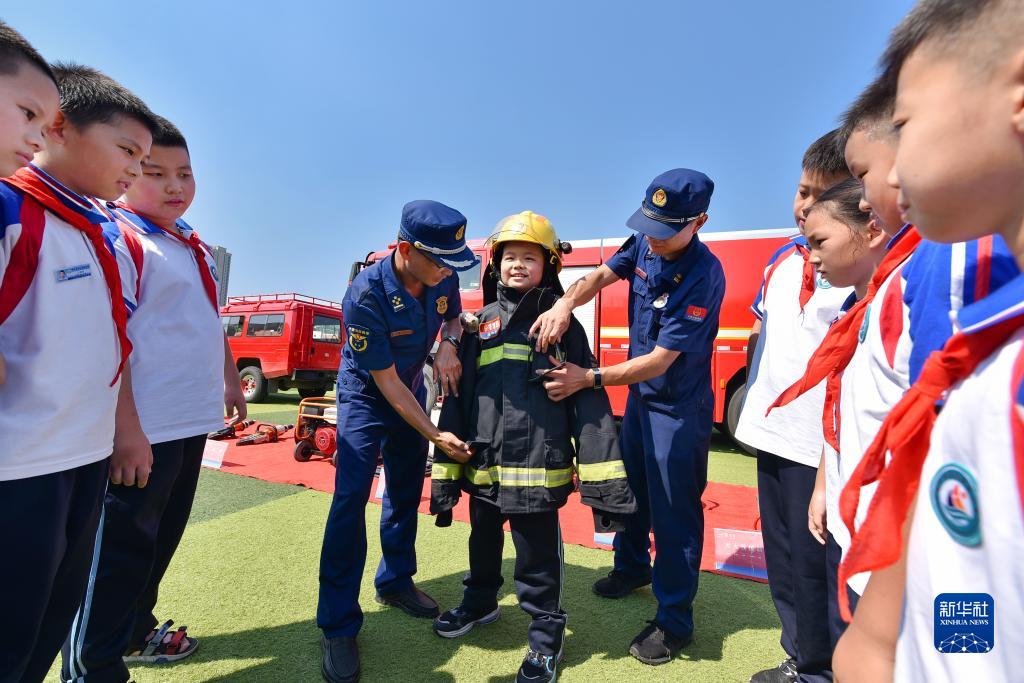 8月31日,在山东邹平市黄山实验小学,小学生体验穿着消防救援服。