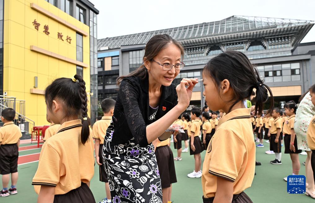 8月31日,北京第二实验小学为一年级新生举办开笔礼。这是老师在开笔礼上为学生点朱砂启智。