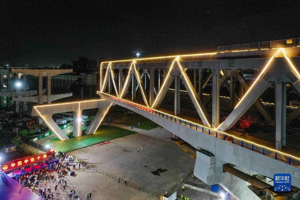 当日凌晨,中铁十局承建的莞(东莞)番(番禺)高速上跨广深铁路主桥完成逆时针81.1°转体,填补了国内双层公路钢砼结合桥转体施工跨越运营铁路的空白。